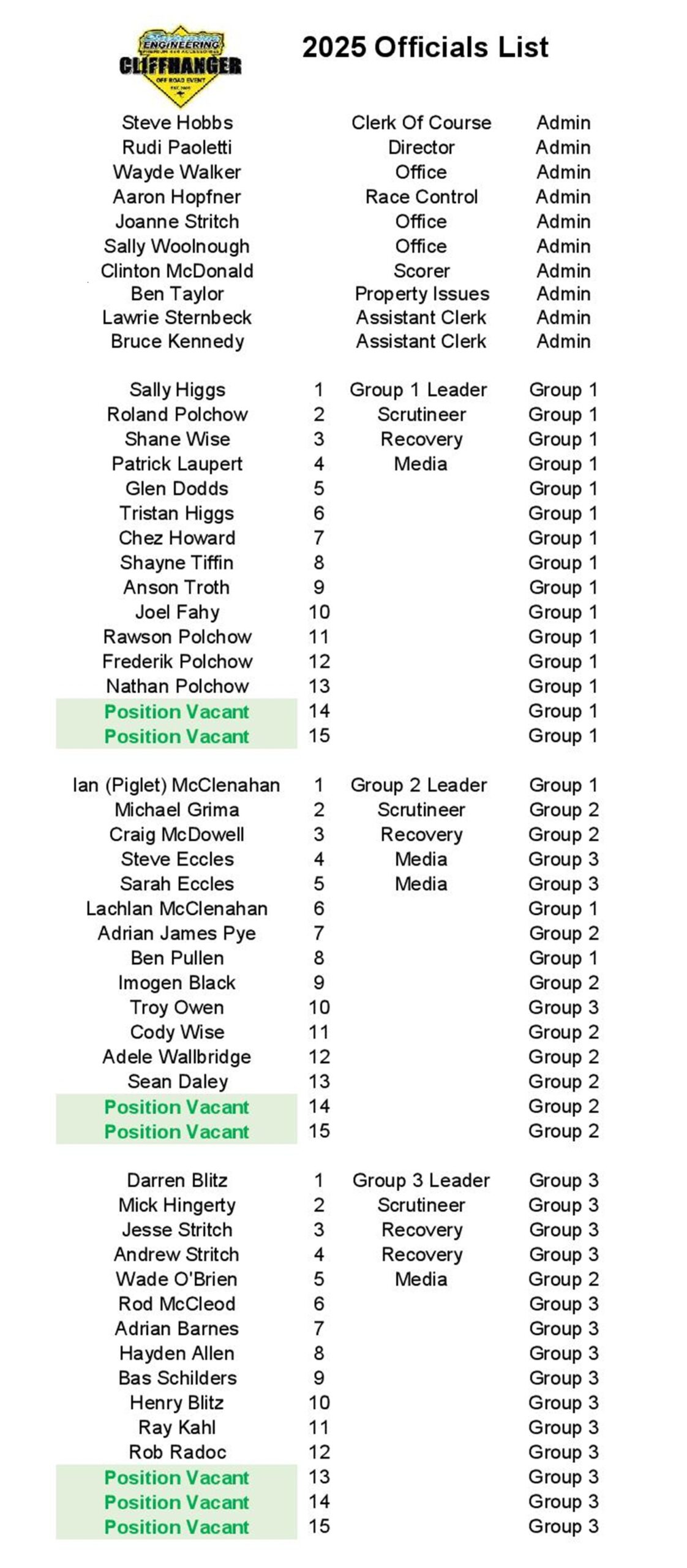 We have an awesome team of Marshals who help with Cliffy. Their commitment and passion for the sport is clearly evident in the fabulous contribution they make. Click on this image to see the list as of 27th June 2025....